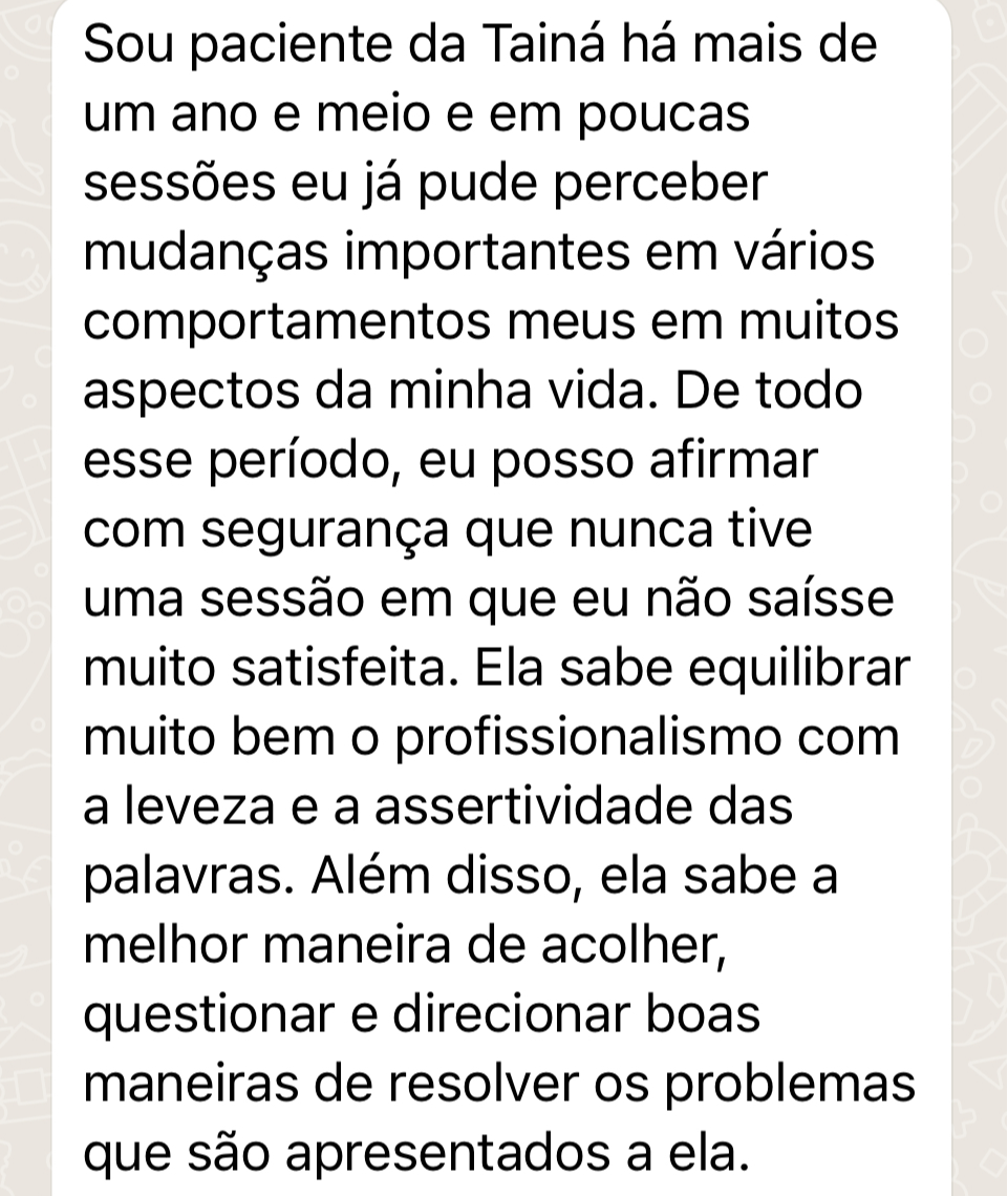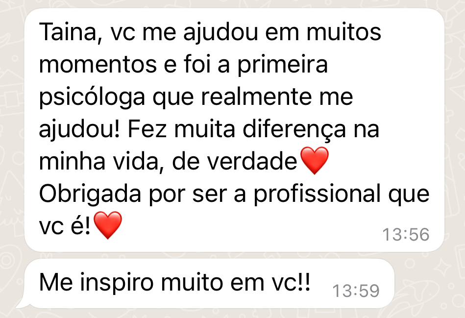Eu sou Tainá Batistel Magnani, psicóloga especialista em Terapia Cognitivo-Comportamental, com mais de 10 mil horas de atendimentos clínicos ajudando mulheres que vivem presas ao ciclo de emocional desregulado → decisões impulsivas → culpa → autossabotagem → efeito sanfona.